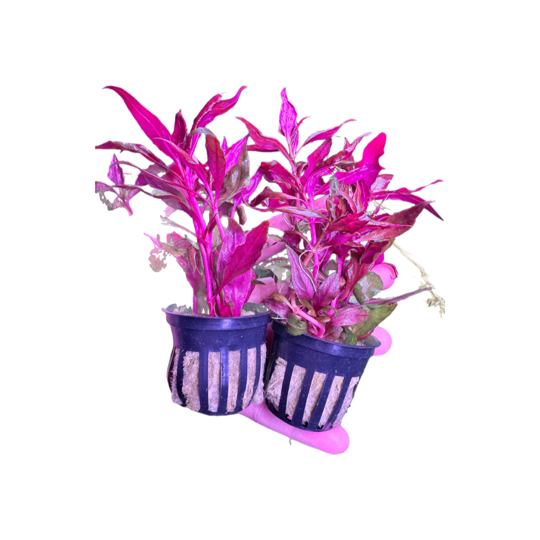 Versión de hojas más intensas y oscuras que la variedad “Pink”. Con tonos púrpura profundos, esta planta aporta dramatismo y sofisticación a tu acuario. Ideal para crear puntos focales y contraste visual. Responde bien a una iluminación adecuada y fertilización líquida. Una joya para acuarios bien cuidados.