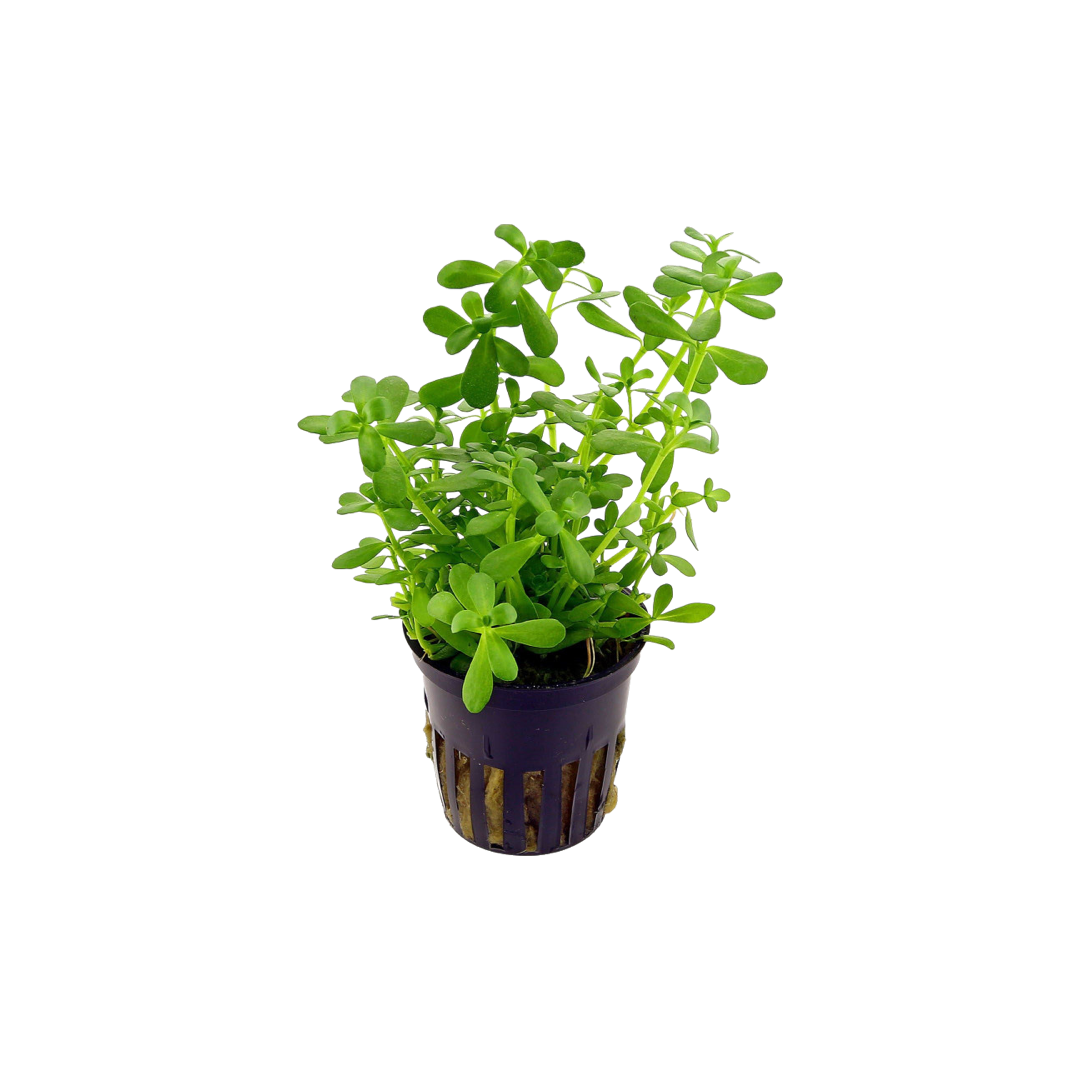 Planta de tallo resistente, ideal para principiantes. Sus hojas redondeadas y verde claro aportan frescura al acuario y ayudan a oxigenar el agua. Crece rápido bajo buena luz, aunque se adapta también a condiciones más sencillas. Ideal para zonas traseras o medias, fácil de podar y replantar. También es usada en paisajismo acuático por su estética sencilla y natural.