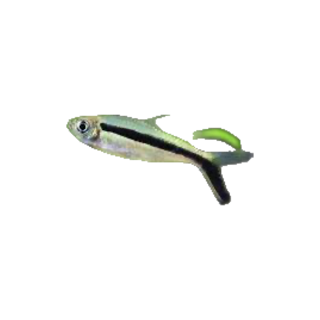 Llamado así por su forma de nadar, como si se deslizara en el agua. Este pequeño y pacífico pez es ideal para acuarios comunitarios. Tiene un cuerpo plateado con una franja negra que lo distingue y su comportamiento en grupo lo hace aún más atractivo.