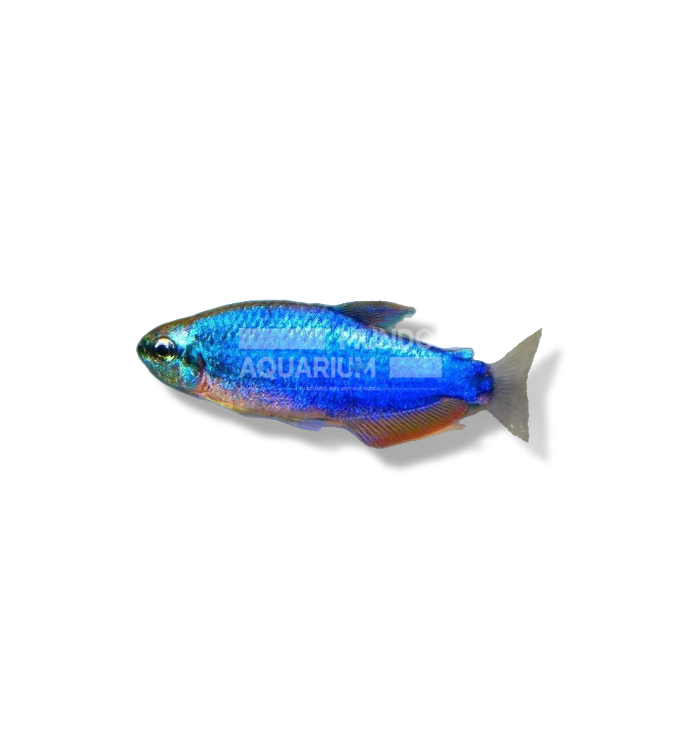Tetra azul eléctrico, muy activo y llamativo en grupo. Tamaño: 2,5-3 cm.